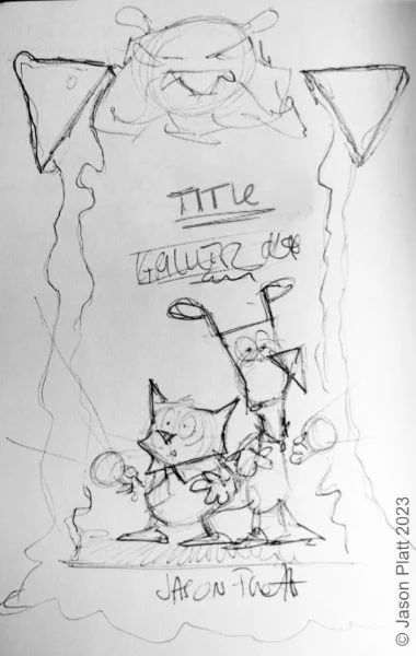 As you can see, the original ideas I had in the original sketch are all here. The only real difference I made is changing Meowiearty into a mysterious hooded figure holding the halves of the sandwich. Having Meoweiarty up at the top might be too suggestive. The blocked scribbles I have above Purrlock and Marlowe’s head are where I signify where I saw the titles and subtitles.